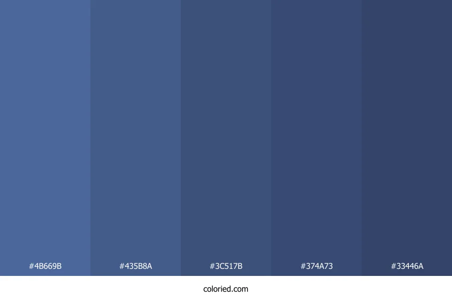 | #435B8A | 67, 91, 138 | 220, 35%, 40% | 51%, 34%, 0%, 46% | oklch(0.473 0.082 263) | |