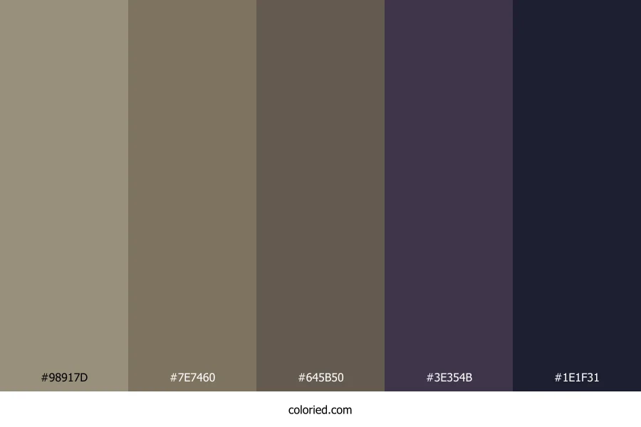 ![]() | #98917D | 152, 145, 125 | 44, 12%, 54% | 0%, 5%, 18%, 40% | oklch(0.657 0.030 91) |