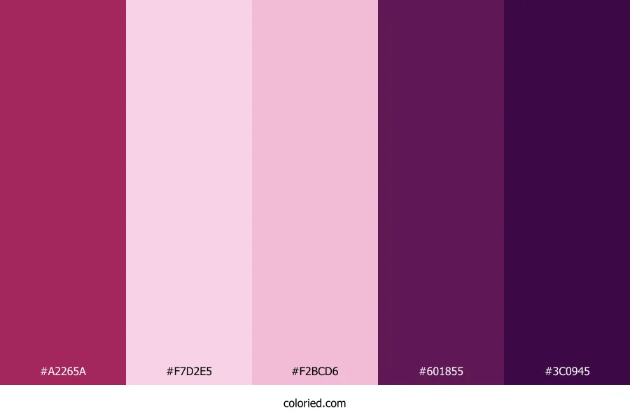 ![]() | #A2265A | 162, 38, 90 | 335, 62%, 39% | 0%, 77%, 44%, 36% | oklch(0.483 0.164 0) |