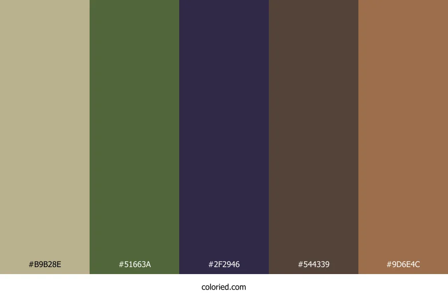 ![]() | #B9B28E | 185, 178, 142 | 50, 23%, 64% | 0%, 4%, 23%, 27% | oklch(0.760 0.050 98) |