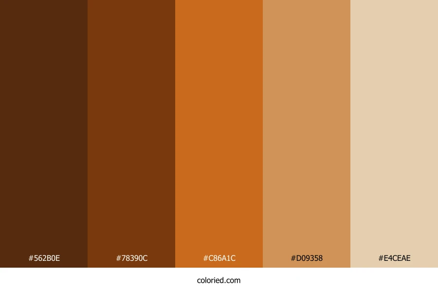 ![]() | #562B0E | 86, 43, 14 | 24, 72%, 20% | 0%, 50%, 84%, 66% | oklch(0.341 0.075 51) |