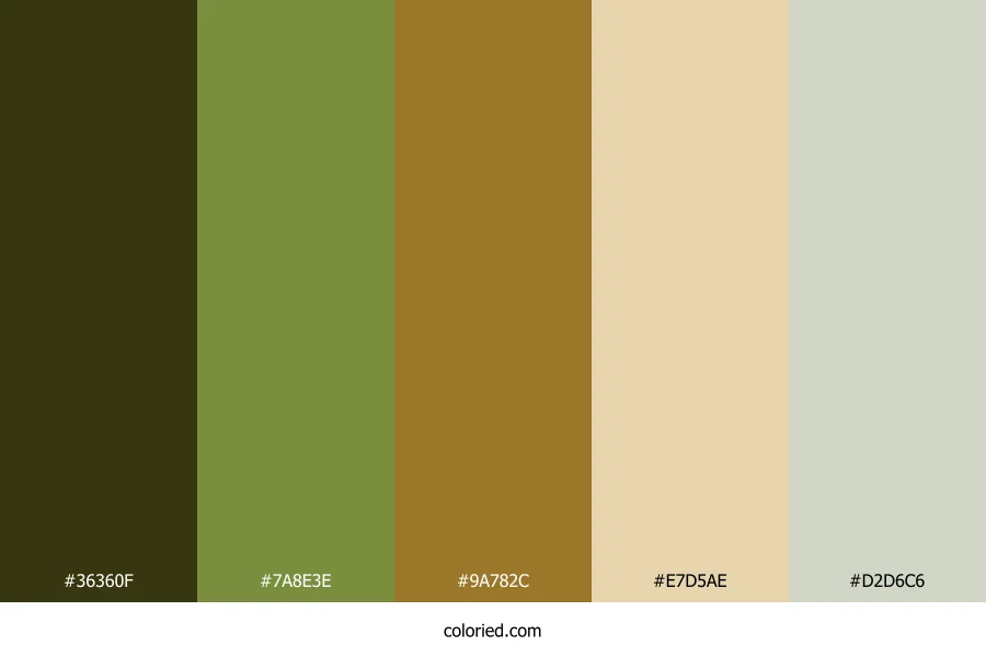 ![]() | #36360F | 54, 54, 15 | 60, 57%, 14% | 0%, 0%, 72%, 79% | oklch(0.324 0.057 109) |
