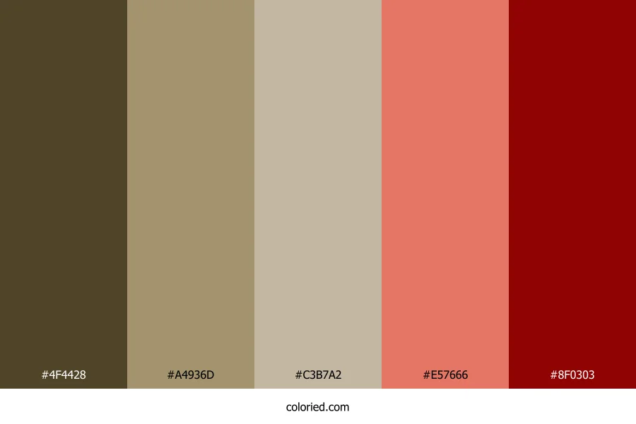 ![]() | #4F4428 | 79, 68, 40 | 43, 33%, 23% | 0%, 14%, 49%, 69% | oklch(0.391 0.045 89) |