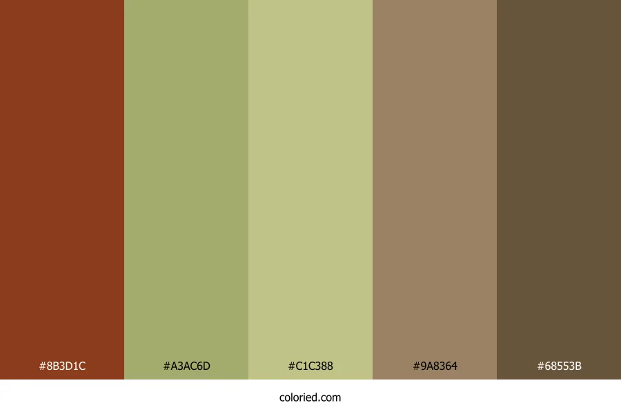 ![]() | #8B3D1C | 139, 61, 28 | 18, 66%, 33% | 0%, 56%, 80%, 45% | oklch(0.458 0.116 42) |