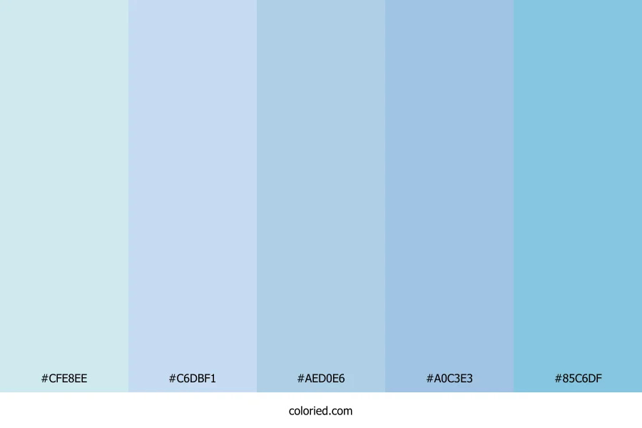 | #AED0E6 | 174, 208, 230 | 204, 53%, 79% | 24%, 10%, 0%, 10% | oklch(0.840 0.048 237) | |
