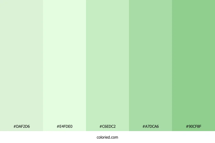 ![]() | #DAF2D6 | 218, 242, 214 | 111, 52%, 89% | 10%, 0%, 12%, 5% | oklch(0.936 0.045 141) |