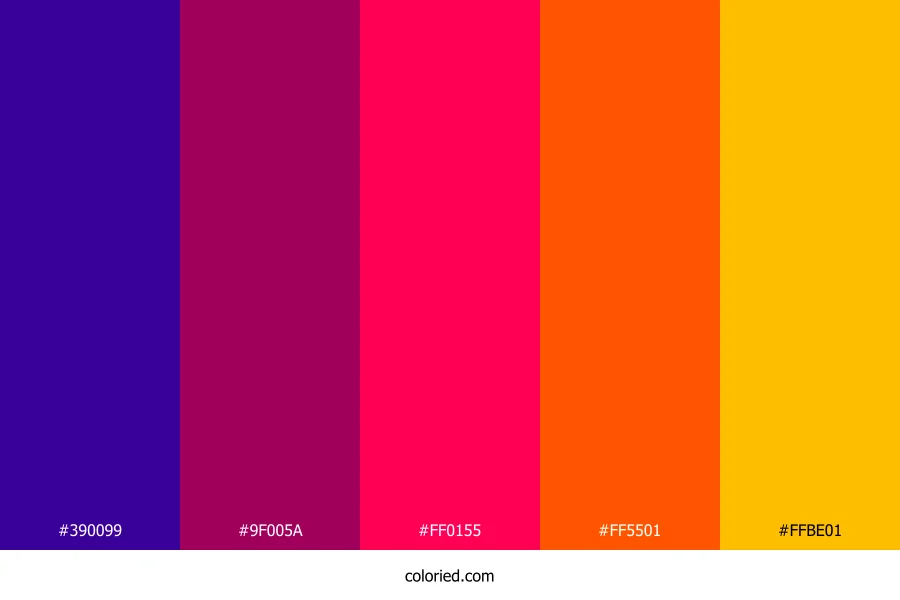 ![]() | #390099 | 57, 0, 153 | 262, 100%, 30% | 63%, 100%, 0%, 40% | oklch(0.343 0.201 285) |