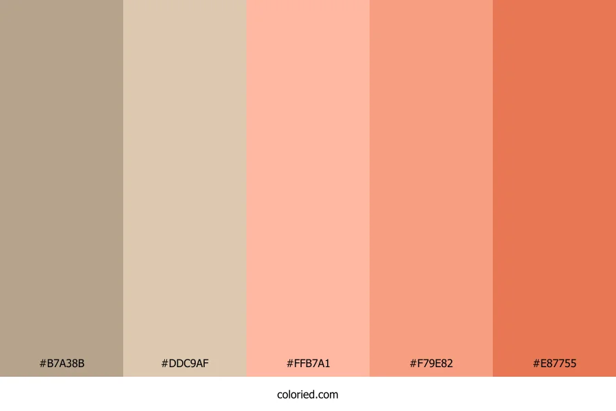 | #FFB7A1 | 255, 183, 161 | 14, 100%, 82% | 0%, 28%, 37%, 0% | oklch(0.841 0.090 38) | |
