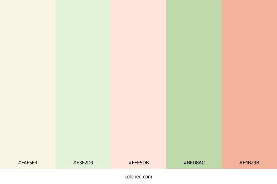 | #BED8AC | 190, 216, 172 | 95, 36%, 76% | 12%, 0%, 20%, 15% | oklch(0.851 0.066 133) | |