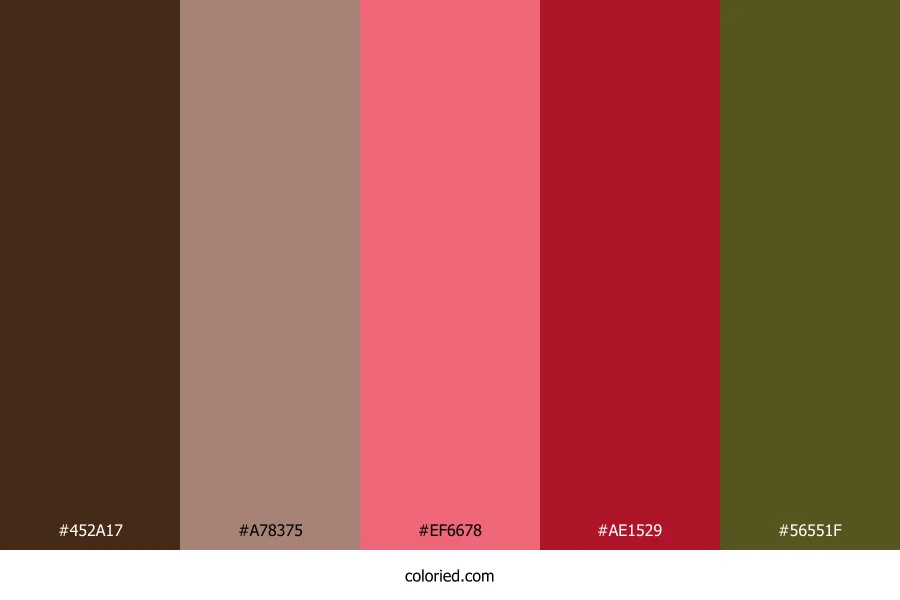 ![]() | #452A17 | 69, 42, 23 | 25, 50%, 18% | 0%, 39%, 67%, 73% | oklch(0.314 0.050 55) |
