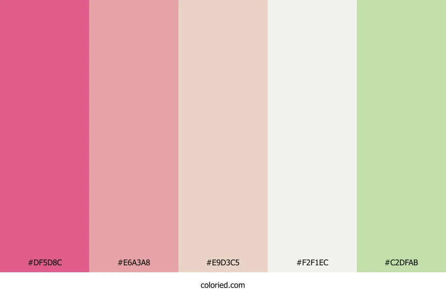 ![]() | #DF5D8C | 223, 93, 140 | 338, 67%, 62% | 0%, 58%, 37%, 13% | oklch(0.655 0.168 0) |