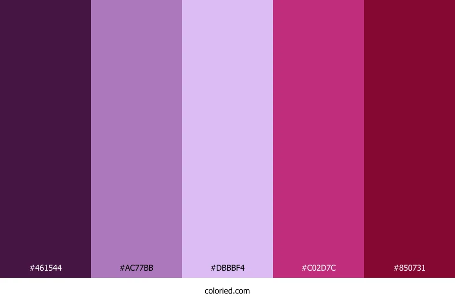 ![]() | #461544 | 70, 21, 68 | 302, 54%, 18% | 0%, 70%, 3%, 73% | oklch(0.295 0.099 329) |