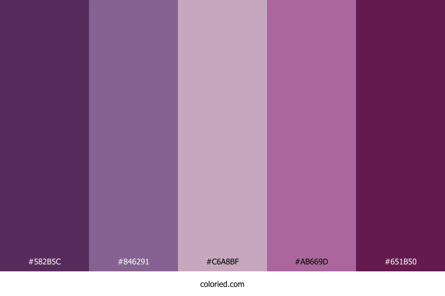 ![]() | #582B5C | 88, 43, 92 | 295, 36%, 26% | 4%, 53%, 0%, 64% | oklch(0.370 0.097 324) |