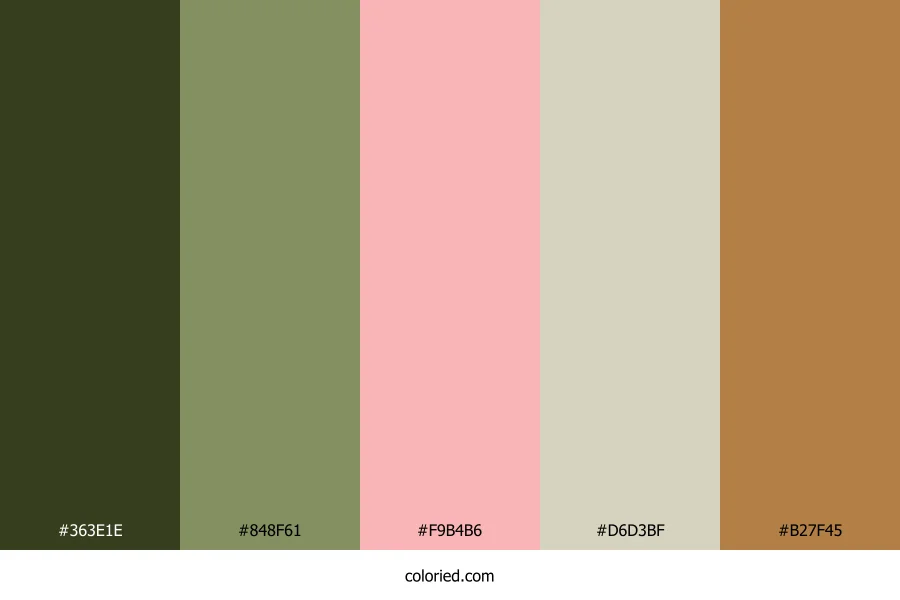 ![]() | #363E1E | 54, 62, 30 | 75, 35%, 18% | 13%, 0%, 52%, 76% | oklch(0.348 0.052 121) |