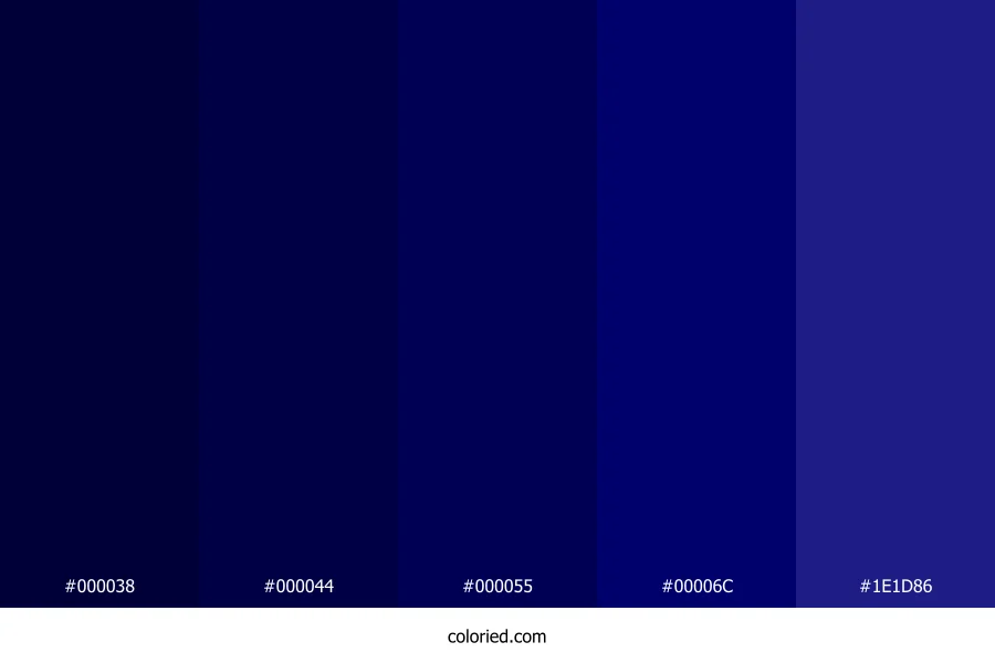 ![]() | #000038 | 0, 0, 56 | 240, 100%, 11% | 100%, 100%, 0%, 78% | oklch(0.154 0.107 264) |