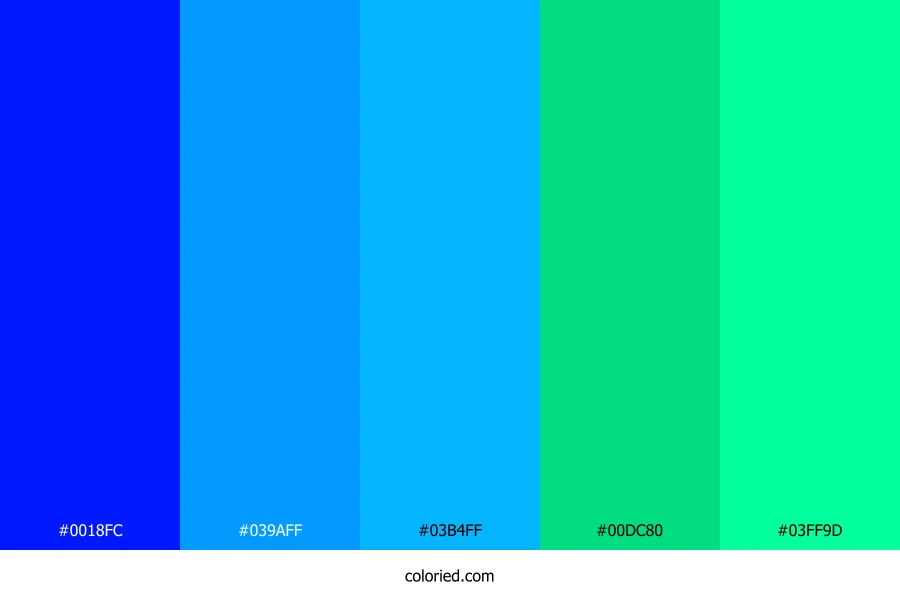 ![]() | #0018FC | 0, 24, 252 | 234, 100%, 49% | 100%, 90%, 0%, 1% | oklch(0.458 0.304 264) |