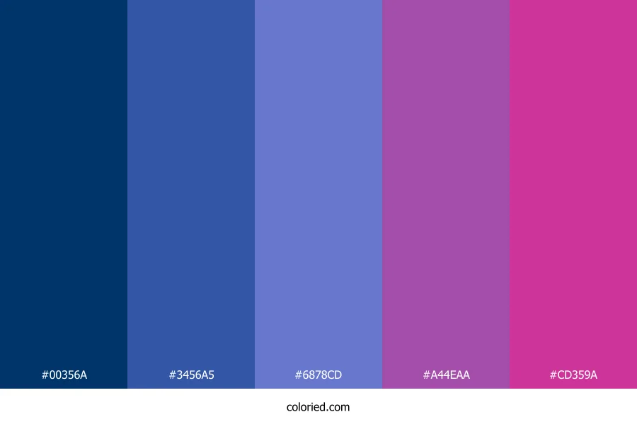 | #3456A5 | 52, 86, 165 | 222, 52%, 43% | 68%, 48%, 0%, 35% | oklch(0.471 0.133 264) | |
