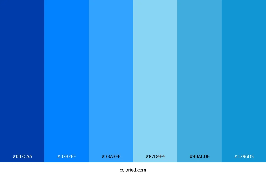 | #1296D5 | 18, 150, 213 | 199, 84%, 45% | 92%, 30%, 0%, 16% | oklch(0.639 0.138 238) |