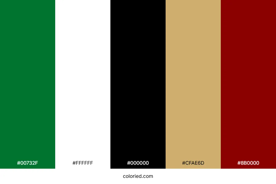 Uae color palette includes 5 carefully selected colors: islamic green (#00732f), white (#ffffff), black (#000000), desert gold (#cfae6d), and dark red (#8b0000).