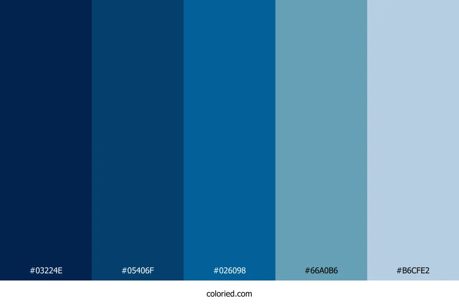 ![]() | #03224E | 3, 34, 78 | 215, 93%, 16% | 96%, 56%, 0%, 69% | oklch(0.261 0.089 258) |