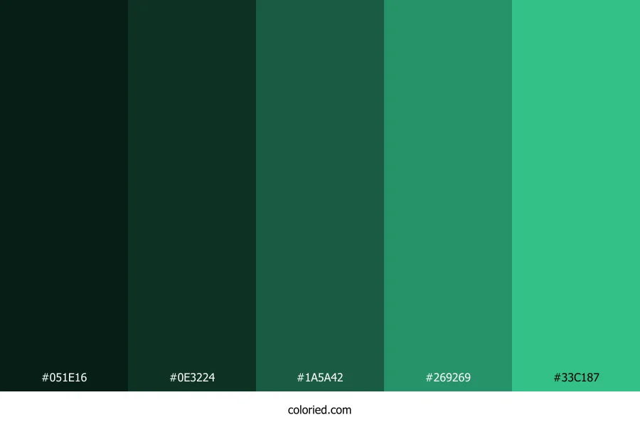 ![]() | #051E16 | 5, 30, 22 | 161, 71%, 7% | 83%, 0%, 27%, 88% | oklch(0.212 0.035 169) |