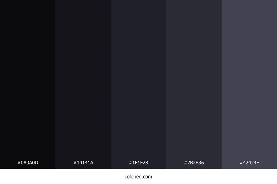 | #1F1F28 | 31, 31, 40 | 240, 13%, 14% | 22%, 22%, 0%, 84% | oklch(0.243 0.017 285) | |