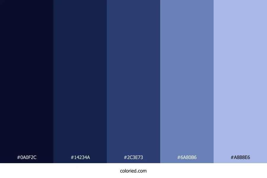 | #14234A | 20, 35, 74 | 223, 57%, 18% | 73%, 53%, 0%, 71% | oklch(0.267 0.075 266) | |