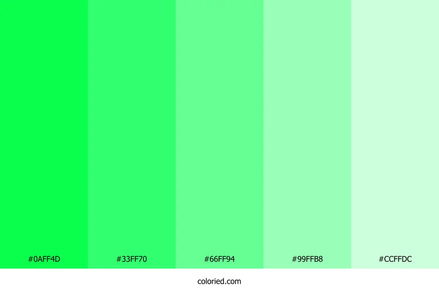 ![]() | #0AFF4D | 10, 255, 77 | 136, 100%, 52% | 96%, 0%, 70%, 0% | oklch(0.870 0.271 145) |