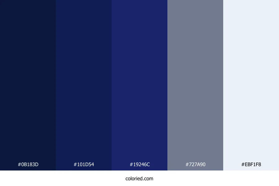 ![]() | #0B183D | 11, 24, 61 | 224, 69%, 14% | 82%, 61%, 0%, 76% | oklch(0.223 0.073 266) |