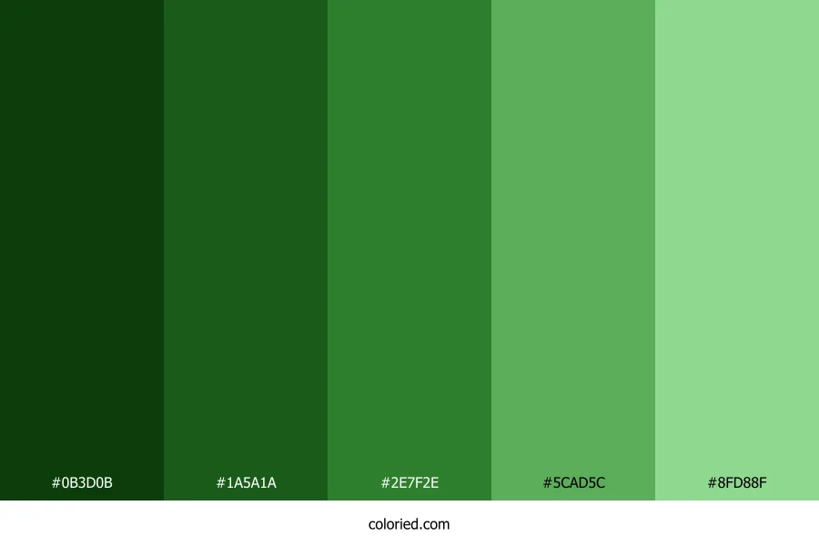 ![]() | #0B3D0B | 11, 61, 11 | 120, 69%, 14% | 82%, 0%, 82%, 76% | oklch(0.316 0.094 143) |