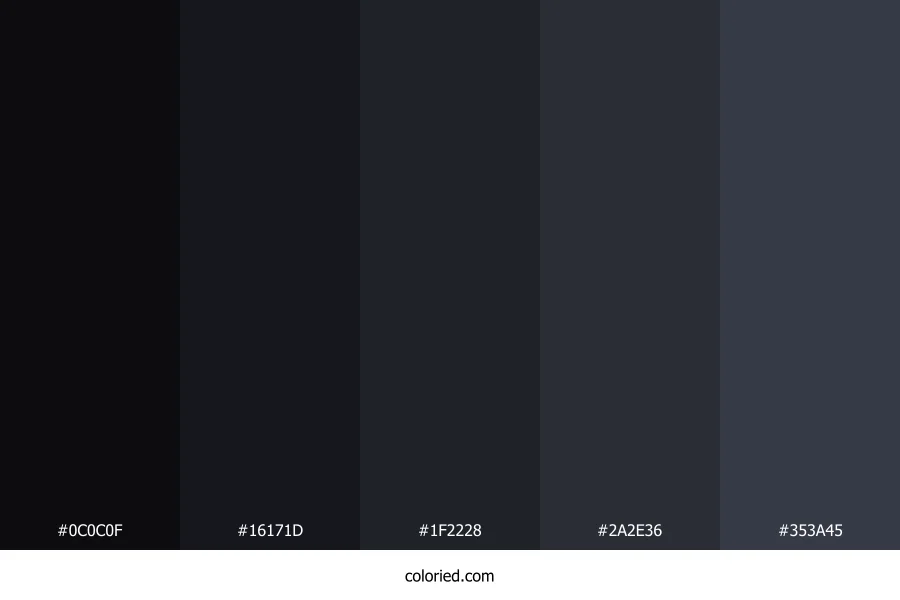 | #1F2228 | 31, 34, 40 | 220, 13%, 14% | 22%, 15%, 0%, 84% | oklch(0.251 0.012 264) | |
