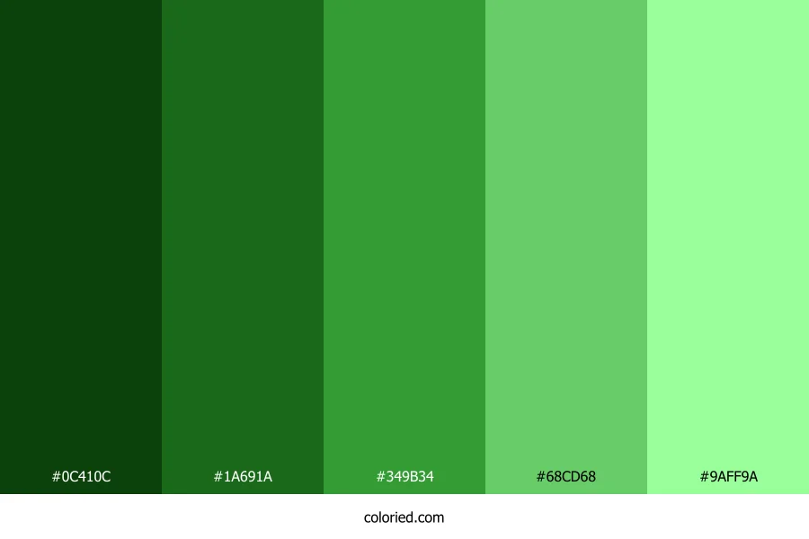 | #349B34 | 52, 155, 52 | 120, 50%, 41% | 66%, 0%, 66%, 39% | oklch(0.608 0.170 143) | |