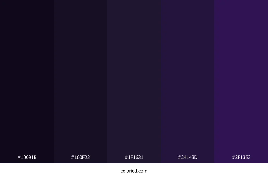 | #1F1631 | 31, 22, 49 | 260, 38%, 14% | 37%, 55%, 0%, 81% | oklch(0.226 0.052 297) | |