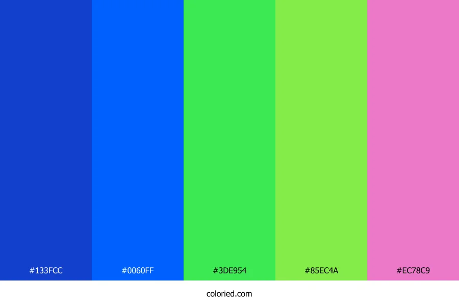 ![]() | #133FCC | 19, 63, 204 | 226, 83%, 44% | 91%, 69%, 0%, 20% | oklch(0.448 0.221 265) |
