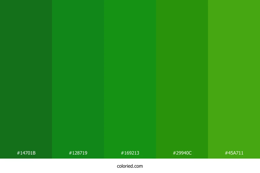 ![]() | #14701B | 20, 112, 27 | 125, 70%, 26% | 82%, 0%, 76%, 56% | oklch(0.477 0.145 144) |