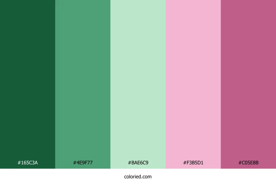 ![]() | #165C3A | 22, 92, 58 | 151, 61%, 22% | 76%, 0%, 37%, 64% | oklch(0.423 0.089 157) |
