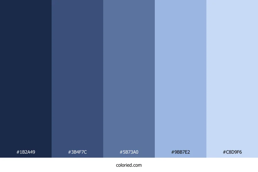 ![]() | #1B2A49 | 27, 42, 73 | 220, 46%, 20% | 63%, 42%, 0%, 71% | oklch(0.289 0.061 264) |