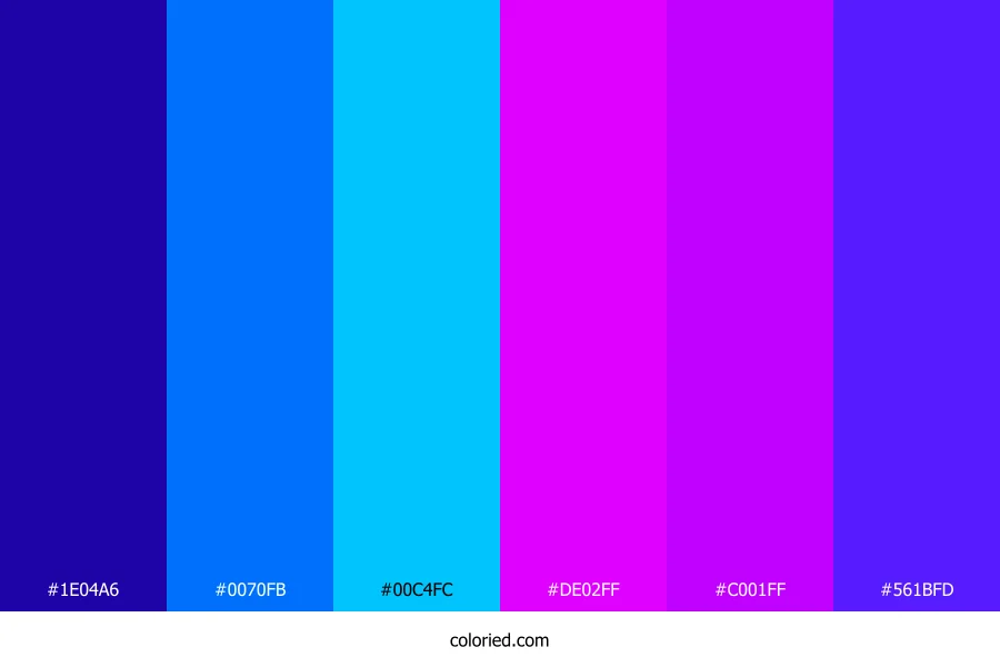 ![]() | #1E04A6 | 30, 4, 166 | 250, 95%, 33% | 82%, 98%, 0%, 35% | oklch(0.341 0.219 271) |