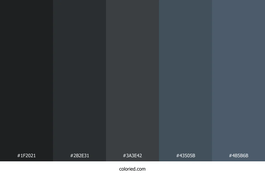 ![]() | #1F2021 | 31, 32, 33 | 210, 3%, 13% | 6%, 3%, 0%, 87% | oklch(0.243 0.002 248) |