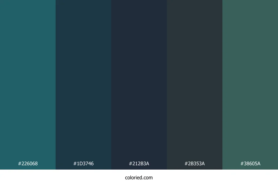 ![]() | #226068 | 34, 96, 104 | 187, 51%, 27% | 67%, 8%, 0%, 59% | oklch(0.453 0.063 207) |