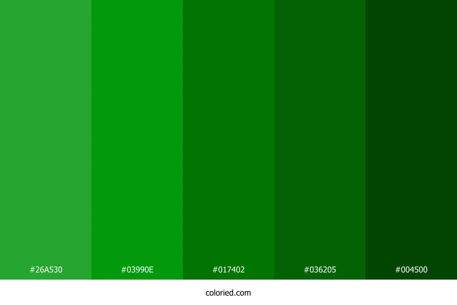 ![]() | #26A530 | 38, 165, 48 | 125, 63%, 40% | 77%, 0%, 71%, 35% | oklch(0.632 0.189 144) |