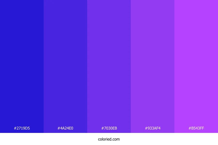 ![]() | #2719D5 | 39, 25, 213 | 244, 79%, 47% | 82%, 88%, 0%, 16% | oklch(0.419 0.257 270) |