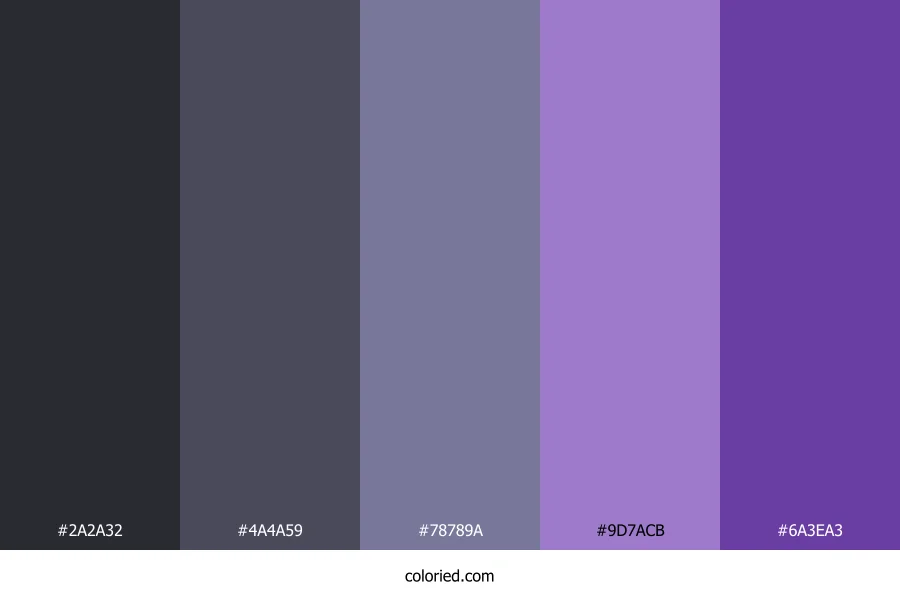 ![]() | #2A2A32 | 42, 42, 50 | 240, 9%, 18% | 16%, 16%, 0%, 80% | oklch(0.288 0.015 285) |