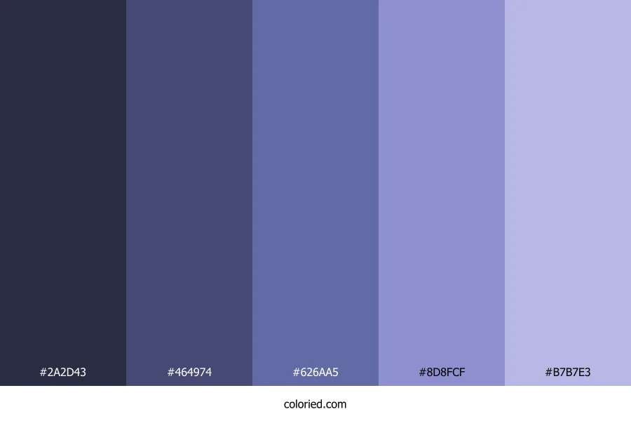 ![]() | #2A2D43 | 42, 45, 67 | 233, 23%, 21% | 37%, 33%, 0%, 74% | oklch(0.305 0.040 278) |