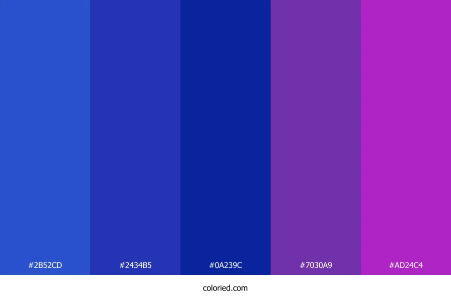| #2434B5 | 36, 52, 181 | 233, 67%, 43% | 80%, 71%, 0%, 29% | oklch(0.412 0.201 269) | |