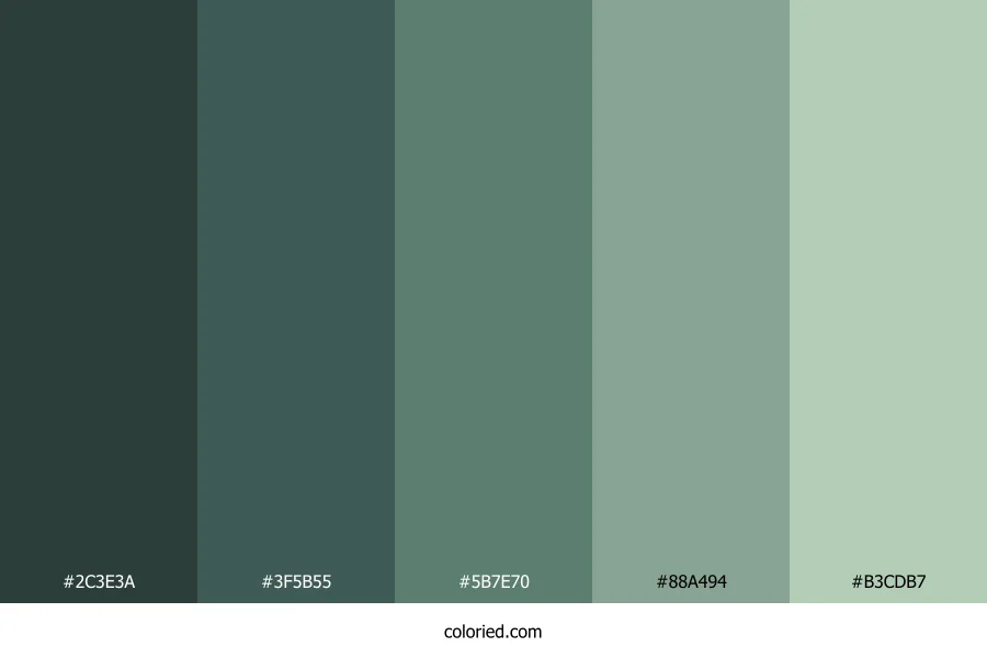 ![]() | #2C3E3A | 44, 62, 58 | 167, 17%, 21% | 29%, 0%, 6%, 76% | oklch(0.347 0.024 180) |