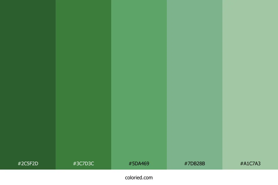 ![]() | #2C5F2D | 44, 95, 45 | 121, 37%, 27% | 54%, 0%, 53%, 63% | oklch(0.437 0.096 144) |