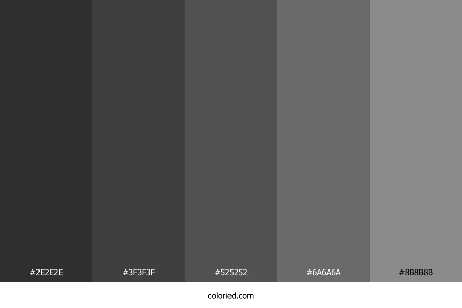 ![]() | #2E2E2E | 46, 46, 46 | 0, 0%, 18% | 0%, 0%, 0%, 82% | oklch(0.301 0.000 263) |