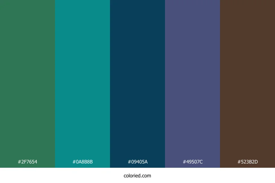 | #09405A | 9, 64, 90 | 199, 82%, 19% | 90%, 29%, 0%, 65% | oklch(0.352 0.070 235) | |