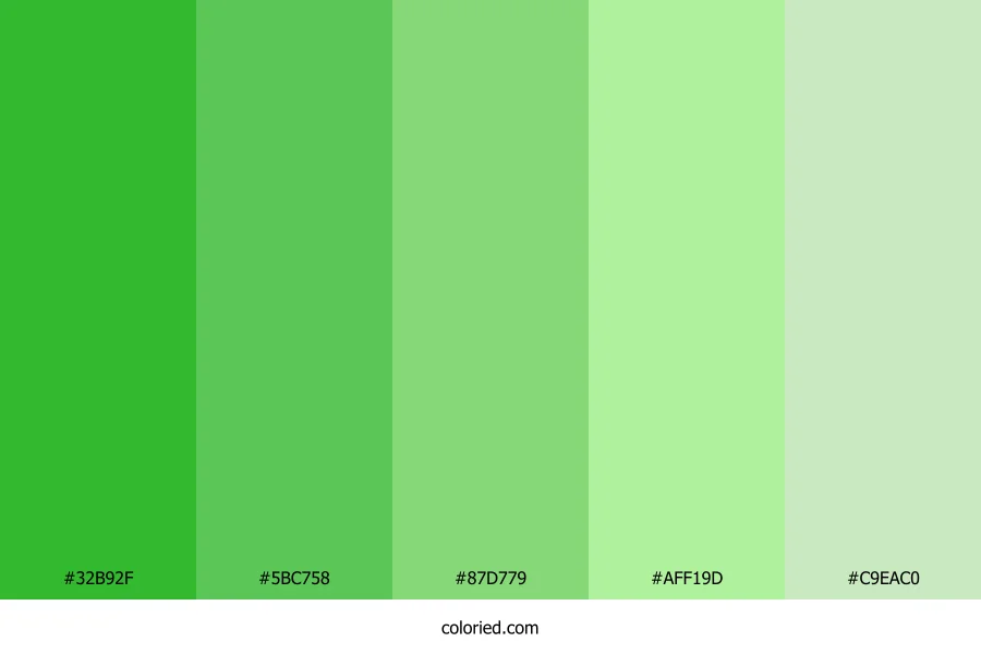 ![]() | #32B92F | 50, 185, 47 | 119, 59%, 45% | 73%, 0%, 75%, 27% | oklch(0.689 0.209 143) |